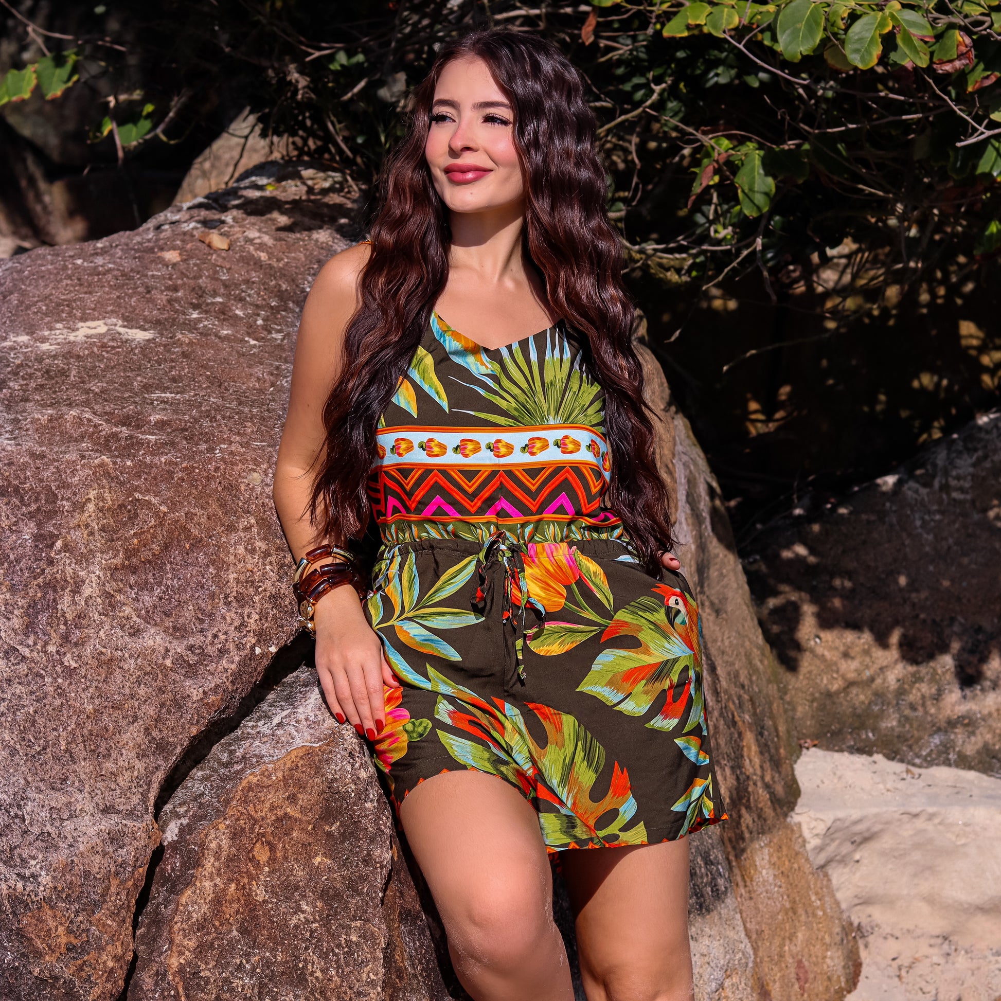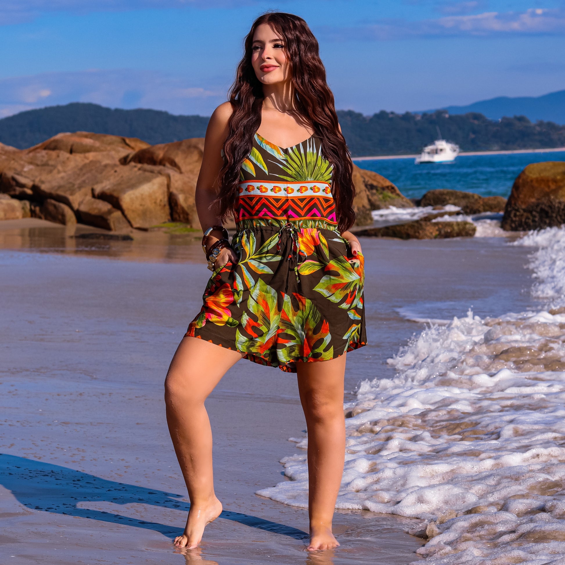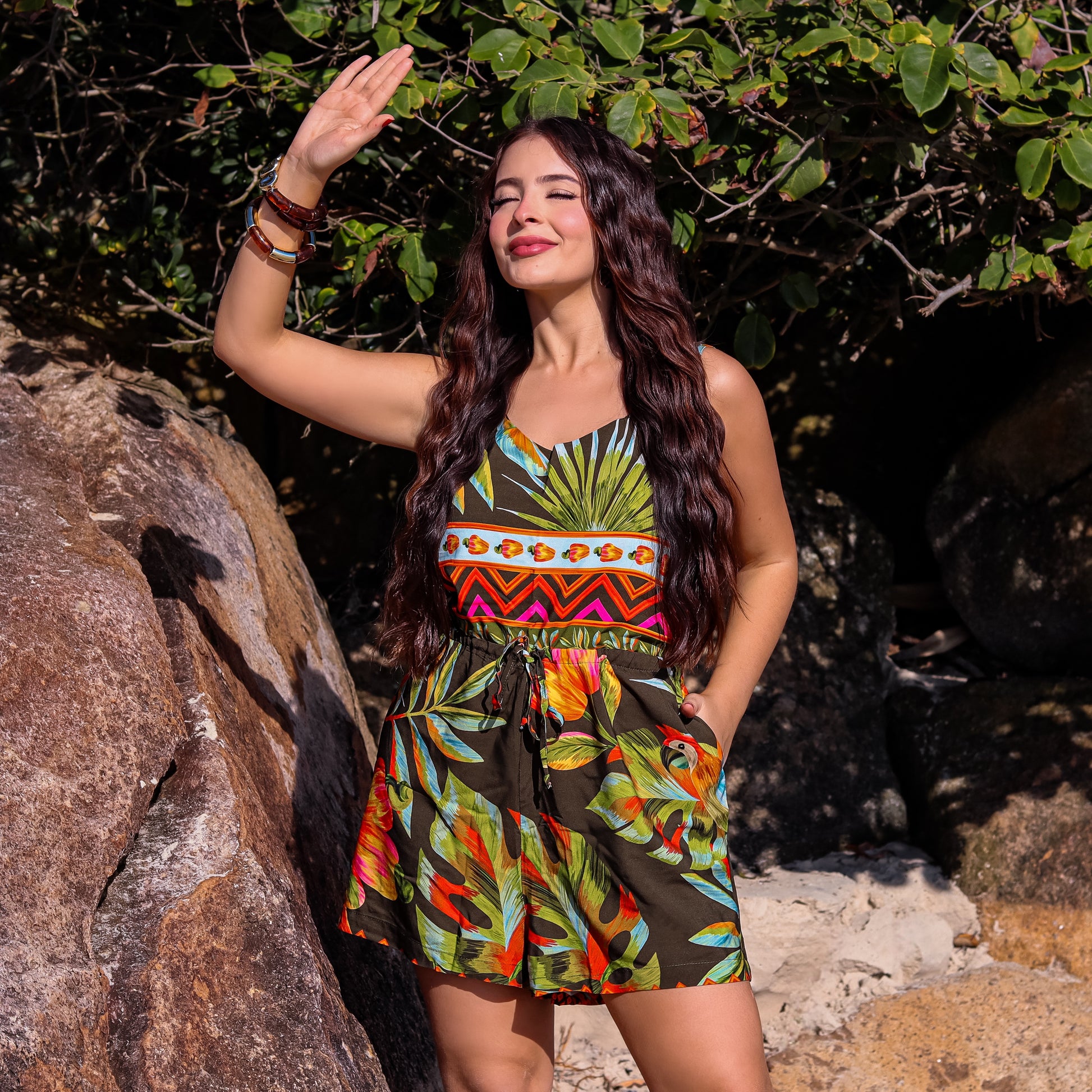 O Macaquinho Maumee Cairo Party é a escolha perfeita para quem busca praticidade com estilo. Com uma estampa alegre e cheia de personalidade, ele traz o espírito vibrante do oriente para o seu guarda-roupa.