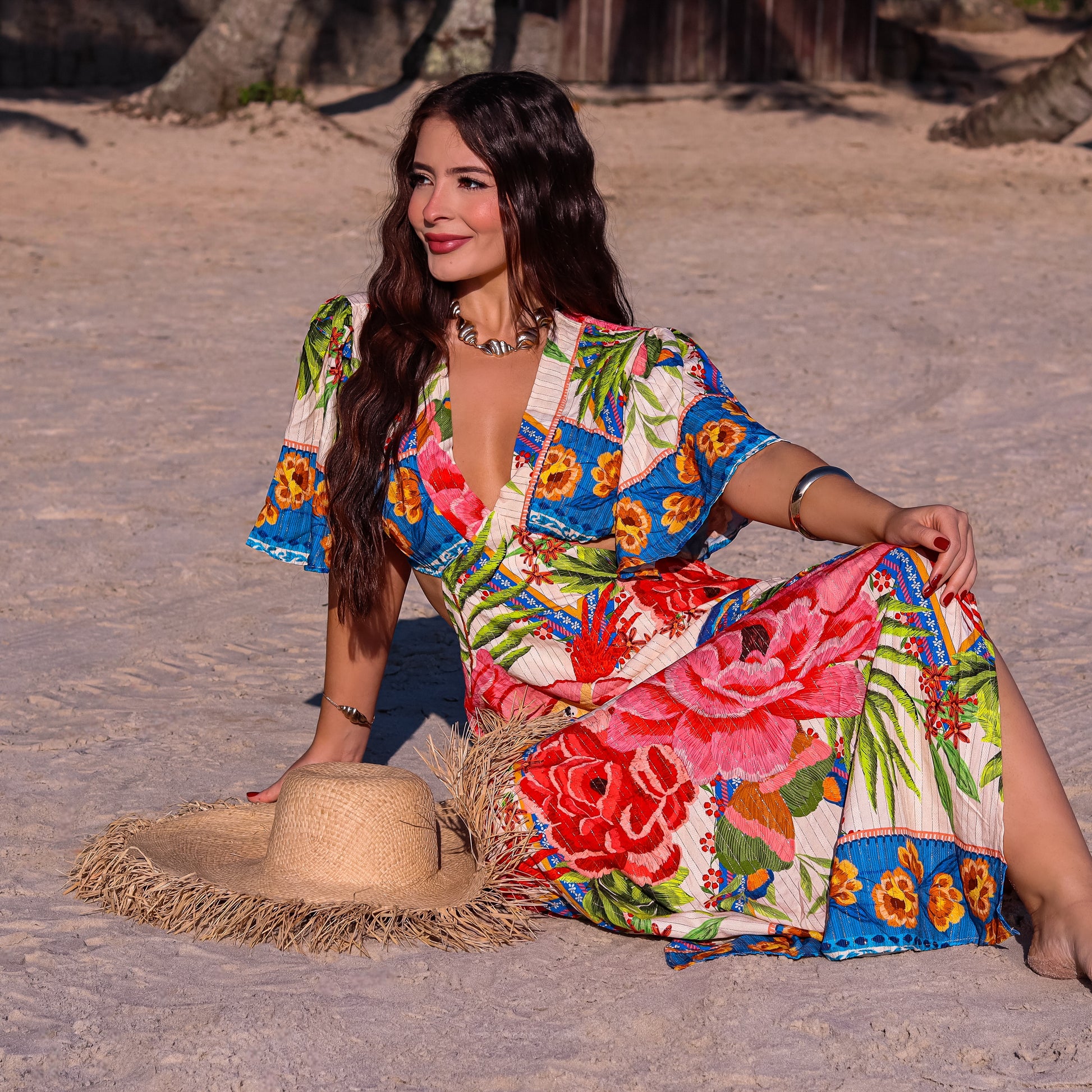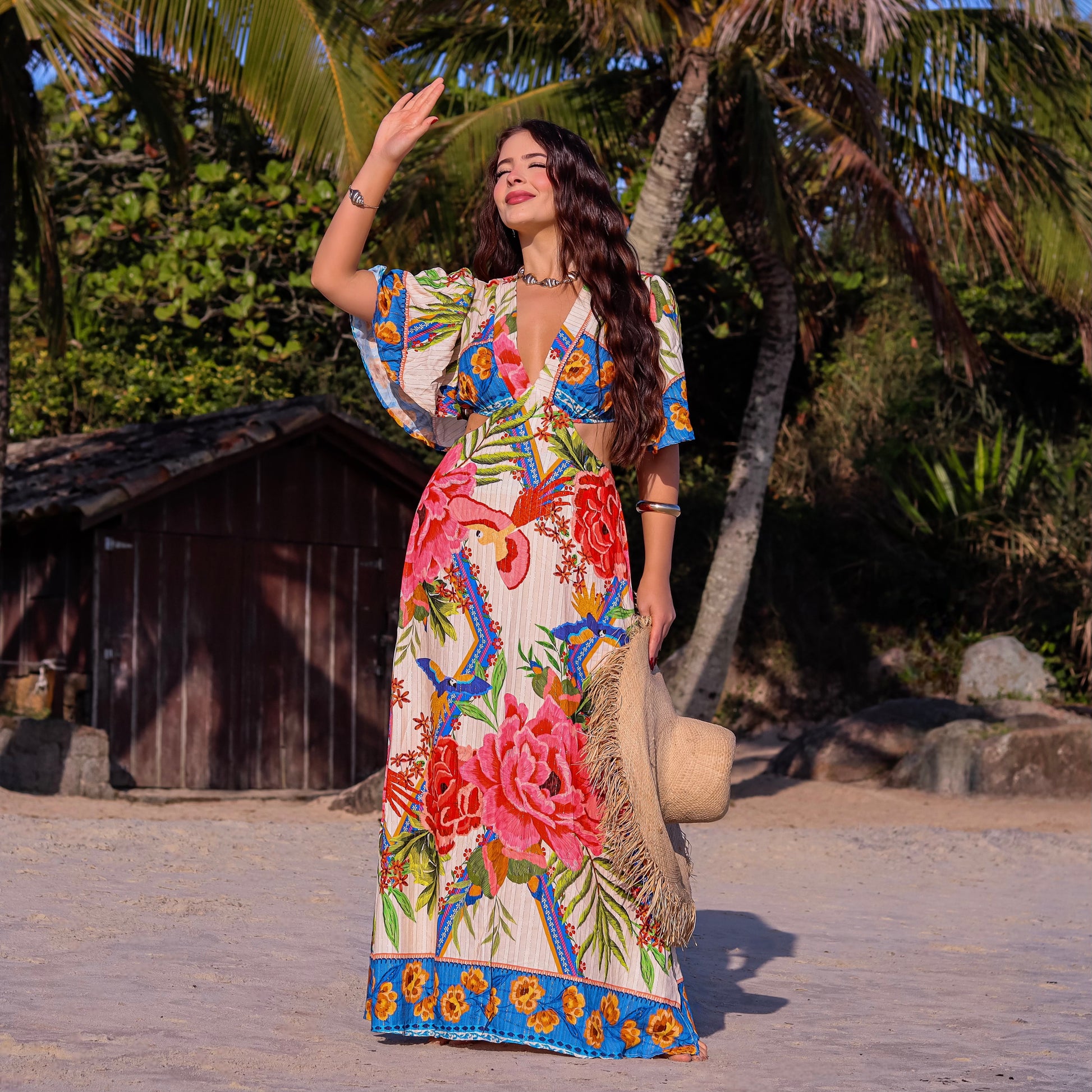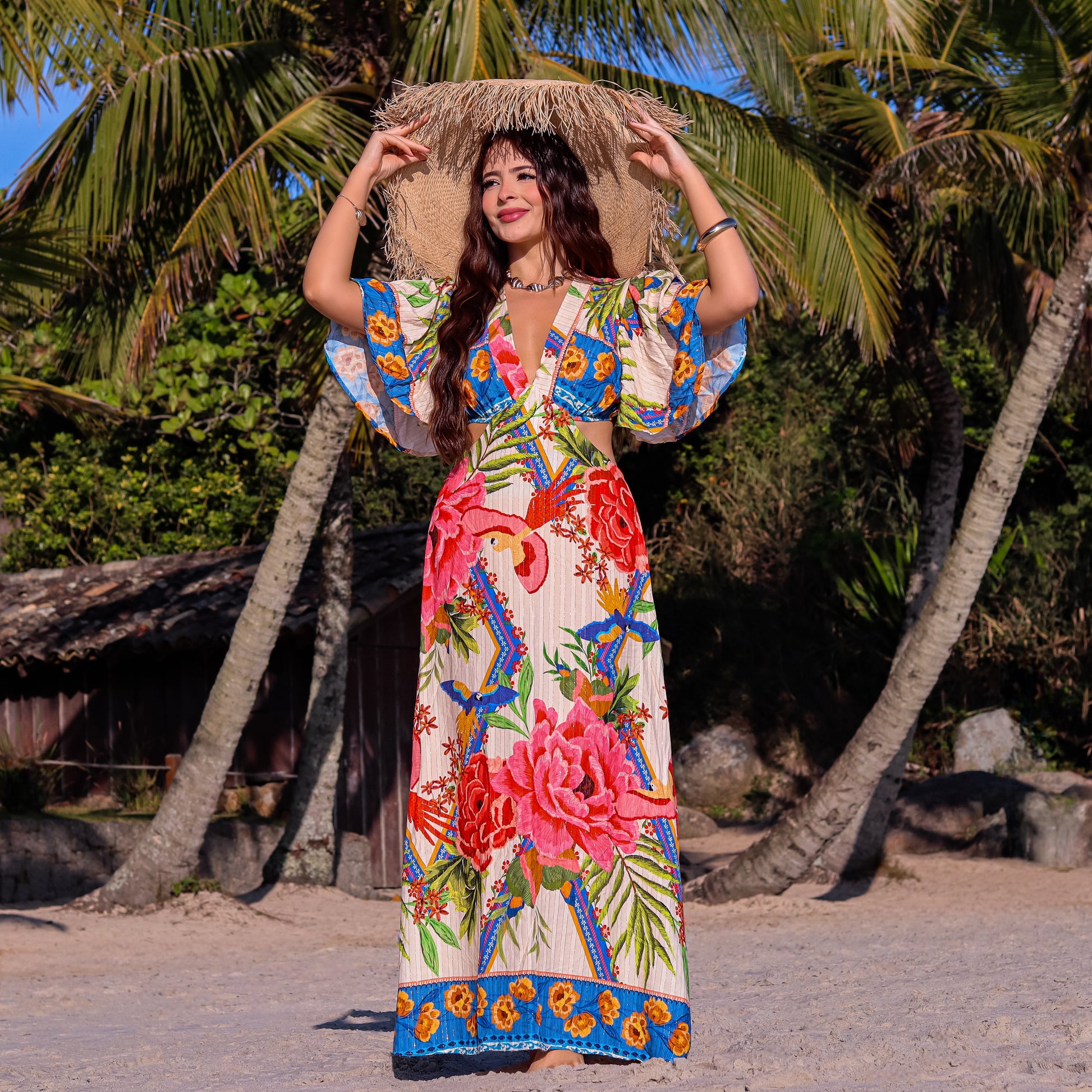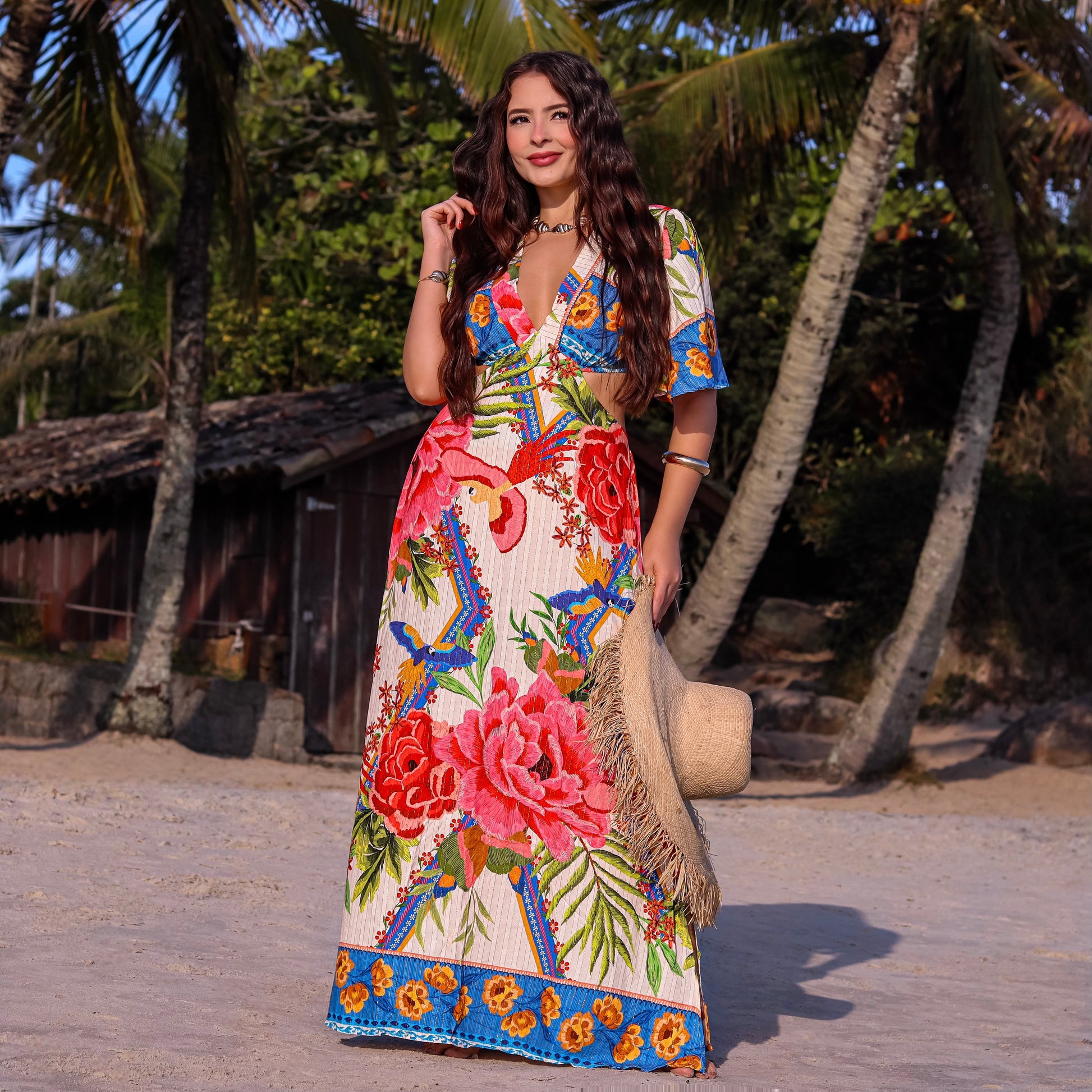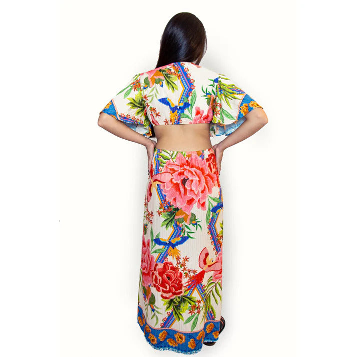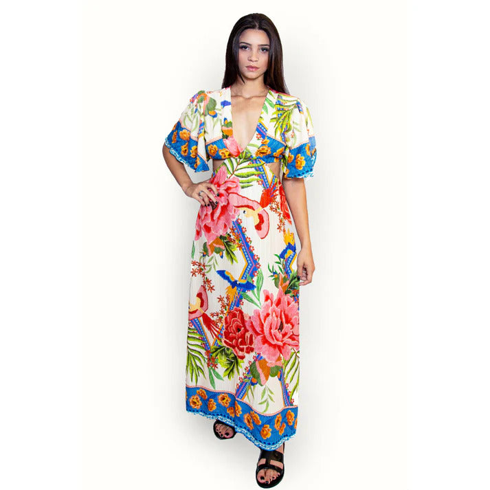 VESTIDO LONGO ESTAMPADO MAUMEE JULIA COM RECORTE NA CINTURA